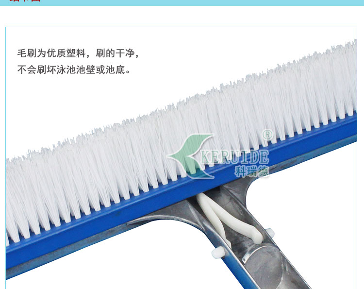 本款池刷能有效刷洗頑固的污漬,使用方便、簡單,質(zhì)量可靠。適用于泳池、桑拿池等。本池刷的特點(diǎn)是鋁背手柄,質(zhì)地輕便,而質(zhì)量相對于塑料手柄高了一個(gè)層次。手柄末端有一個(gè)孔用于和伸縮桿相連,手柄中間還有一個(gè)起固定作用的扣緊夾子美觀堅(jiān)固。能夠刷下附于池底和池壁的頑固污漬的同時(shí)保護(hù)泳池池底池壁不損壞池子,適合于任何材質(zhì)的池壁。