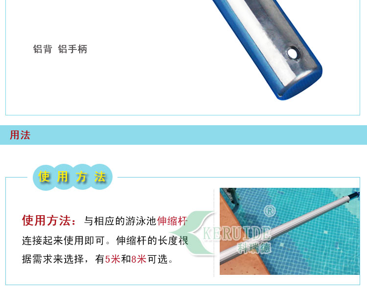 【用法】:與相應(yīng)的游泳池伸縮桿連接起來使用即可。伸縮桿的長度根據(jù)需求來選擇,有5米和8米可選。