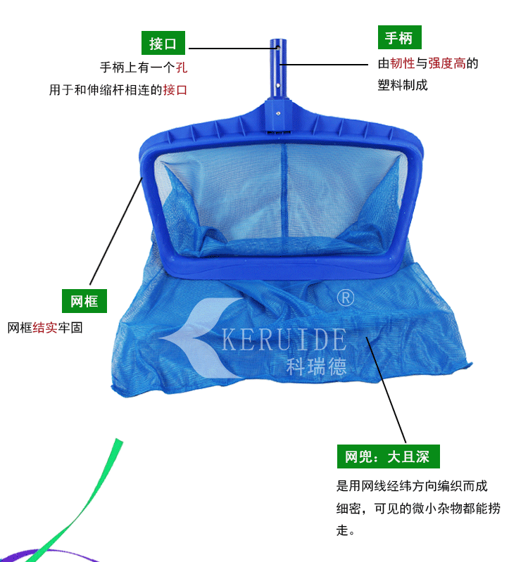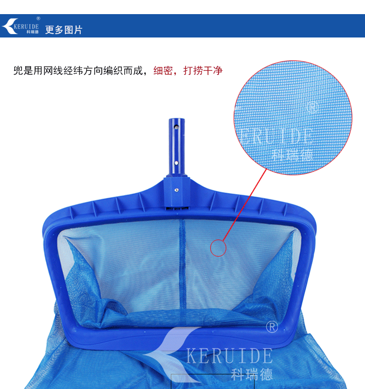 【游泳池深水網】:網兜大而深,網格細密,可打撈可見的各種雜物。主要用于打撈水中及水底的臟物及水中的小蟲等。