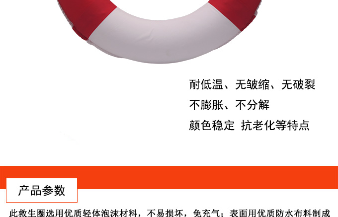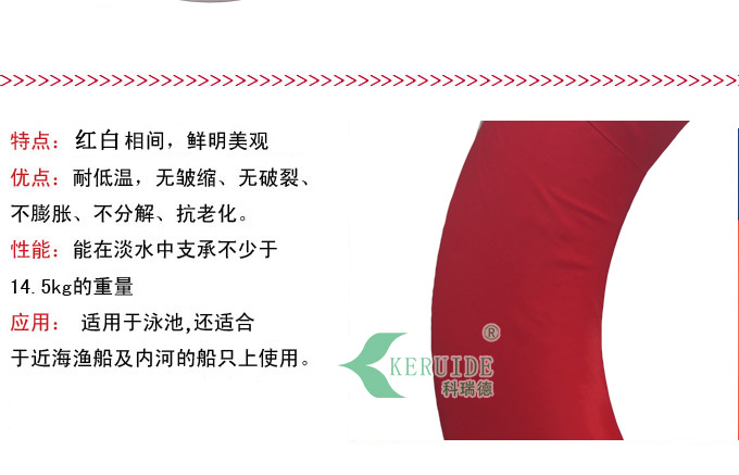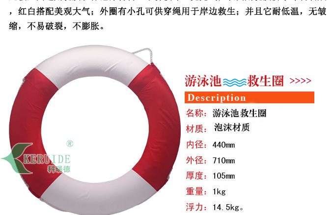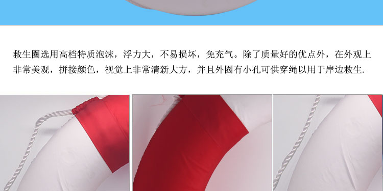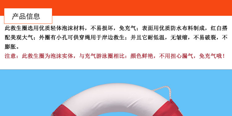 救生圈款式新穎,攜帶方便、造型美觀大氣:顏色由紅白拼成,深受廣大朋友們的喜愛。救生圈外徑約710mm,內徑約440mm,適合廣大游泳者使用。它由輕質泡沫制成的,實用性等都比充氣的救生圈好。