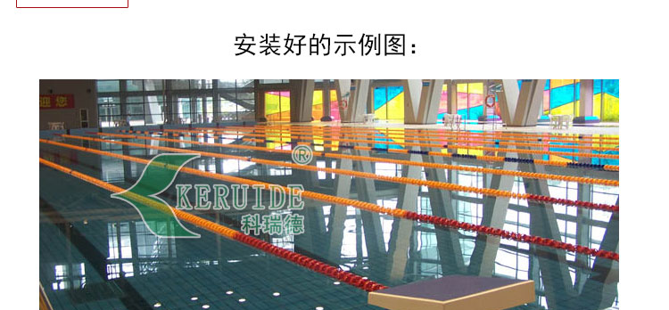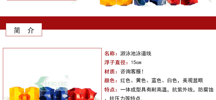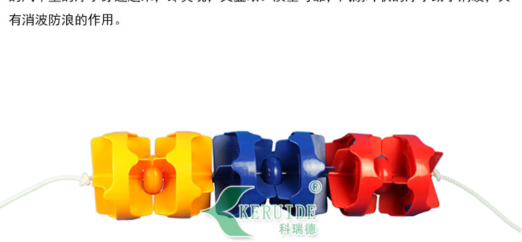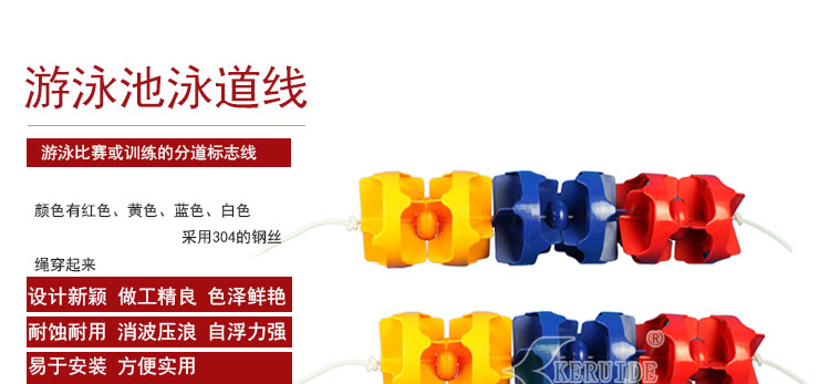 本款泳道線設(shè)計(jì)新穎:從產(chǎn)品圖片可以看出它是由小珠子將兩個(gè)浮子合起來(lái),消波阻浪。色澤鮮艷:紅藍(lán)黃三種明亮的顏色完美配合,耐蝕耐用、抗老化,壽命長(zhǎng)、自浮力強(qiáng),易于安裝等特點(diǎn)。