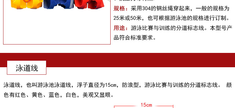 游泳池泳道線,也叫游泳池分道線,直徑為15cm,防浪型,游泳比賽或訓(xùn)練的分道標(biāo)志線,本型號(hào)產(chǎn)品符合標(biāo)準(zhǔn)。