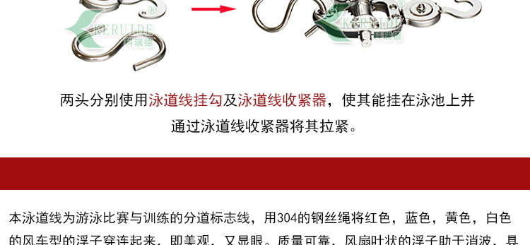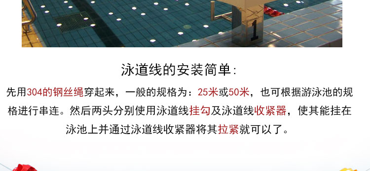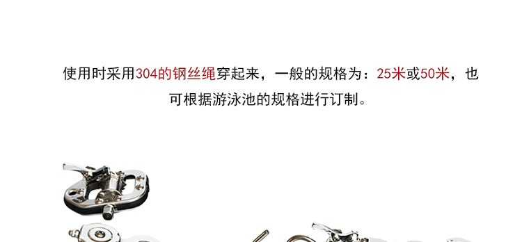 一般的規(guī)格為:25米或50米,也可根據(jù)游泳池的規(guī)格進(jìn)行訂制。兩頭分別使用泳道線掛勾及泳道線收緊器,使其能掛在泳池上并通過(guò)泳道線收緊器將其拉緊。