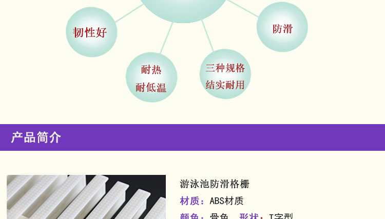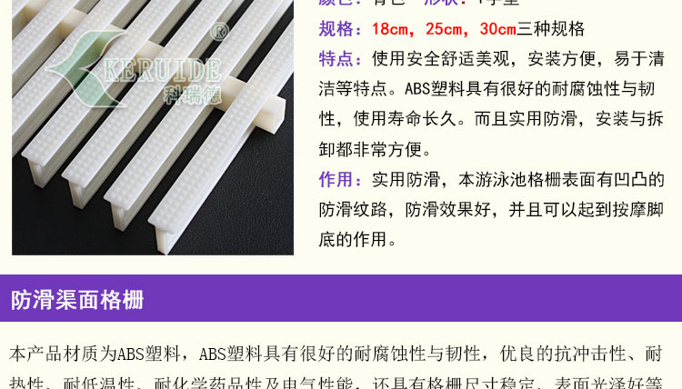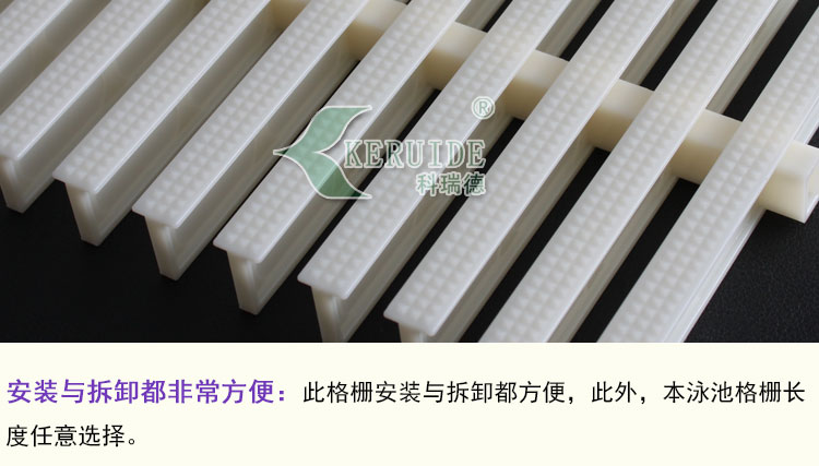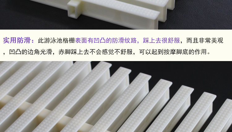 本泳池格柵采用ABS改性工程塑料模塑而成,本產(chǎn)品具有以下特點(diǎn):