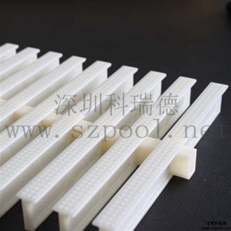 游泳池格柵又,名格柵,防滑渠面格柵或者是游泳池排水溝格柵。游泳池格柵是作為游泳池四周排水溝的塑料蓋板。本產品具有:防滑、耐腐蝕,抗老化等特性,組分容易,安裝簡單,它的梳形格柵接口不會堵塞,令清潔工作輕松方便,并可根據泳池的各種形狀隨意隨意拼接而無須裁剪。