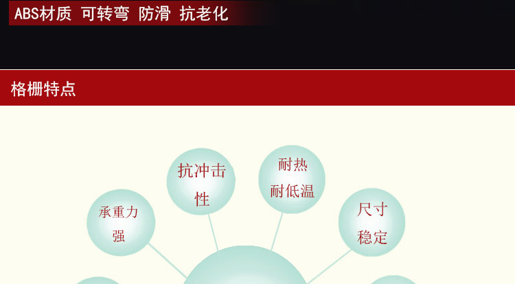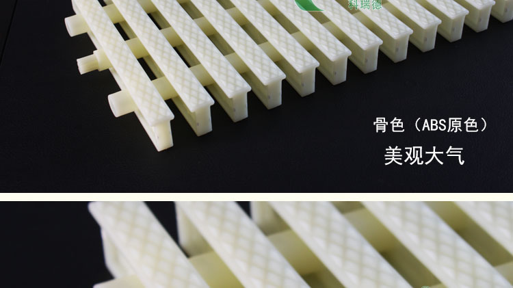 其二:耐腐蝕性以及防老化,韌性,本產(chǎn)品采用的是ABS材質(zhì),ABS塑料,具有很好的耐腐蝕性與韌性,質(zhì)量可靠,使用壽命長久。還具有格柵尺寸穩(wěn)定、表面光澤性好等特點。
