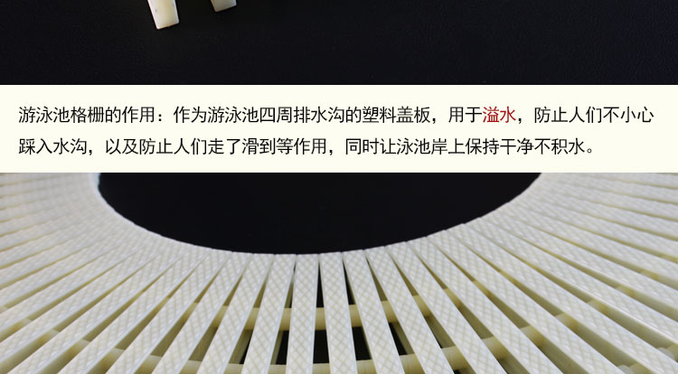 游泳池排水溝格柵,是放在覆蓋在泳池排水溝的用于溢水的塑料蓋板。又名游泳池溢水格柵、防滑篦子、渠面篦子。大家簡稱其為格柵。游泳池格柵對于保持地面干凈不積水,防止人們滑倒。