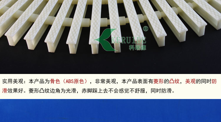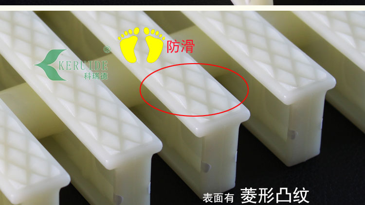 其一:防滑性,本泳池格柵表面布滿菱形的凸紋,具有非常好的防滑效果,凸紋邊緣柔和,清洗方便。