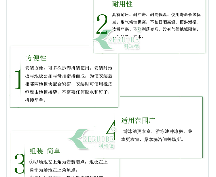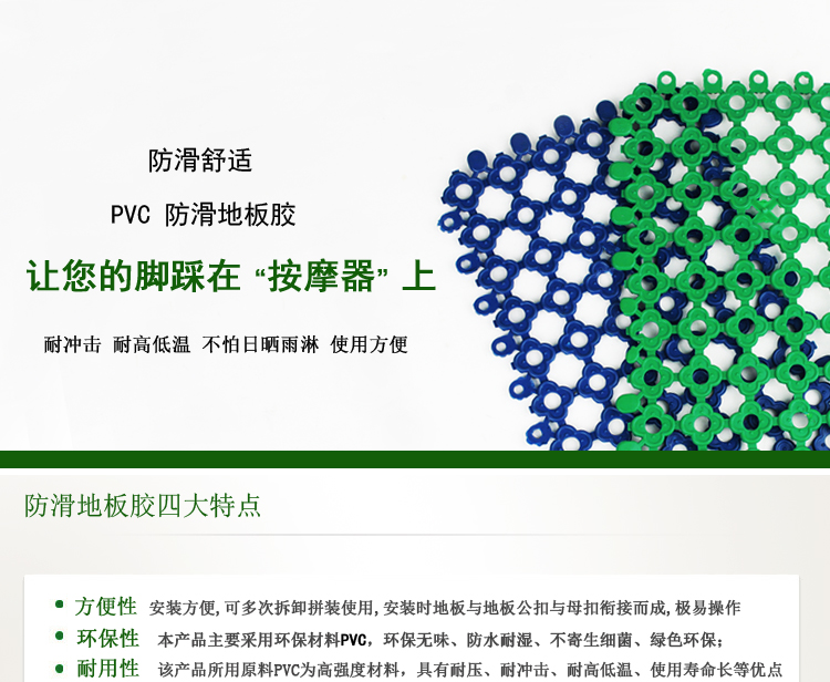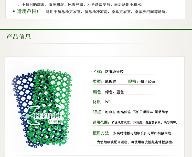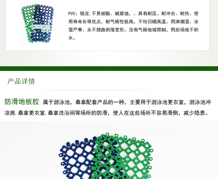 防滑地板膠屬于游泳池,桑拿配套產品的一種,主要用于游泳池更衣室,游泳池沖涼房,桑拿更衣室,桑拿洗浴間等場所的防滑,使人在這些場所不容易滑倒,保證安全.防滑地板膠也叫防滑墊,更衣室防滑墊,游泳池防滑地板膠.