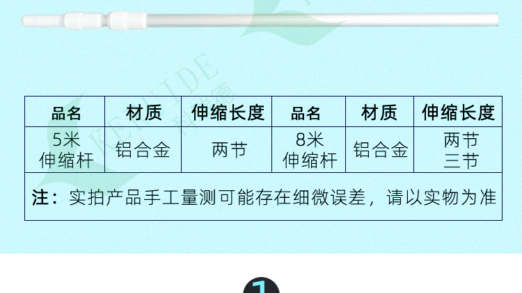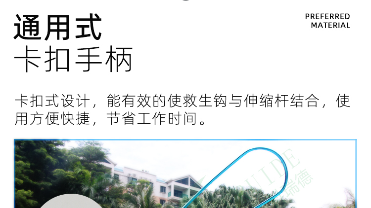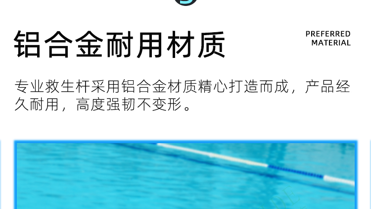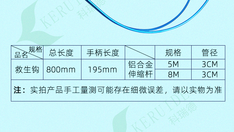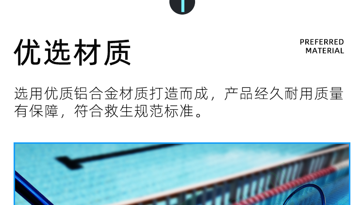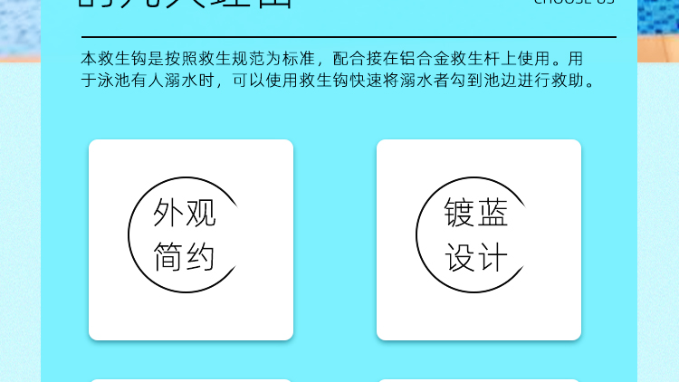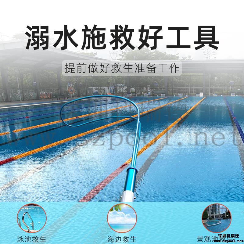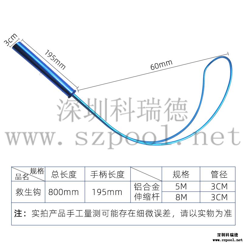 游泳池管理者可以根據自己的需求購買,并且,伸縮桿有5米及8米之分,泳池管理者也需要自行選擇。本救生鉤上新款表面鍍有一層藍色,大方美觀。