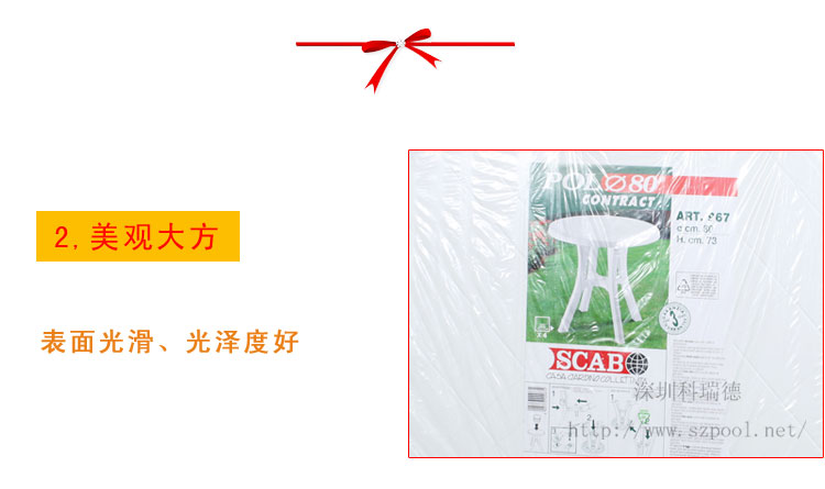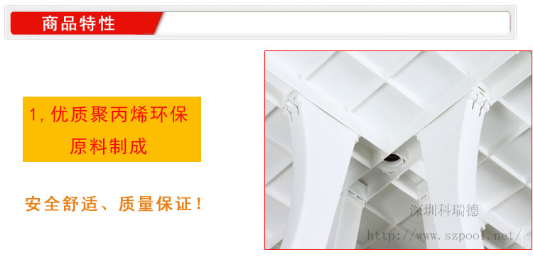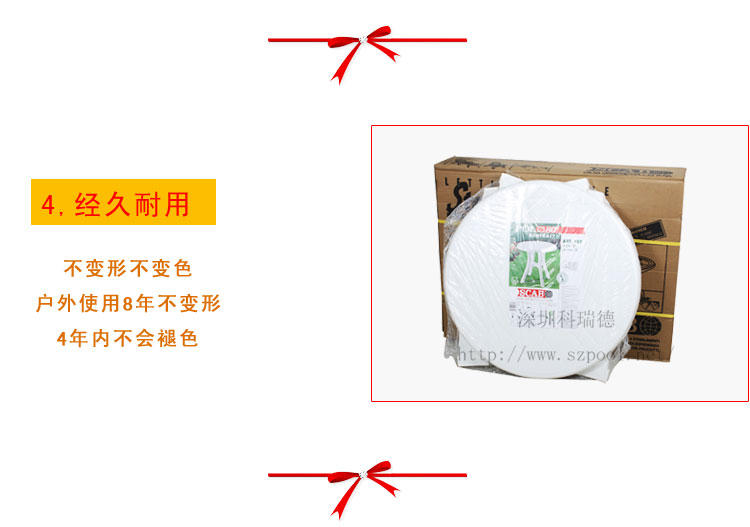 產品優質聚丙烯環保原料,防紫外線,4年內不會褪色;耐氣候,零下20℃不老化、折疊后存儲運輸都很方便。表面光滑、安全舒適、質量可靠、耐老化、價格合理、結構堅固,抗日曬雨淋,戶外使用常年不變形,不褪色。光澤度好,深受顧客好評。