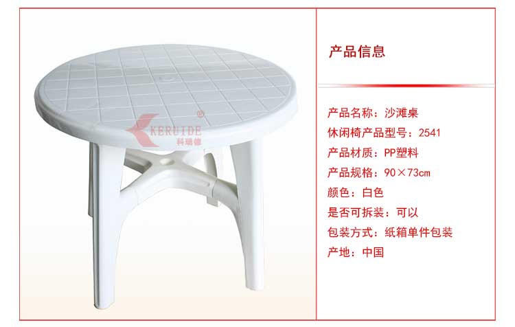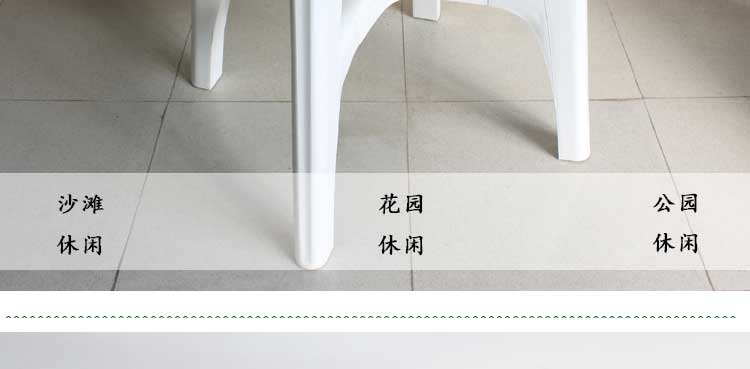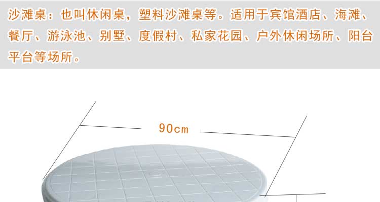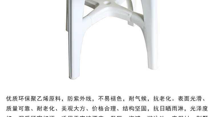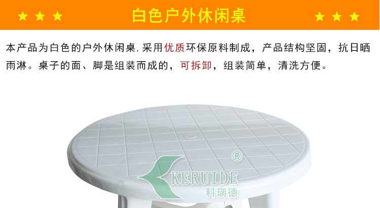 本產品為白色的戶外休閑桌椅,采用優質環保原料,產品結構堅固,抗日曬雨淋。桌子的面、腳是組裝而成,可拆卸,組裝簡單,清洗方便。