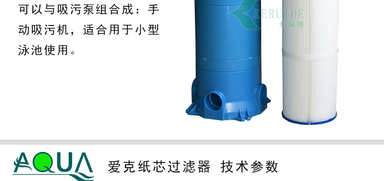 這是一款紙芯過濾器是用于游泳池水過濾的過濾設(shè)備,能去除游泳池水中的懸浮物,使水變澄清.也叫: 過濾器。可以與吸污泵組合成:手動(dòng)吸污機(jī),適合用于小型泳池使用。