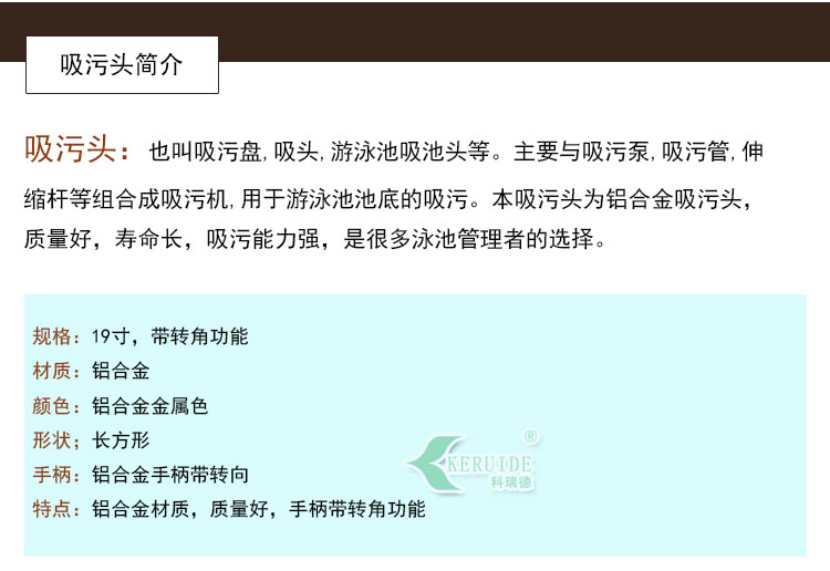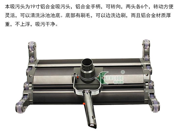 本吸污頭為19寸鋁合金吸污頭,鋁合金手柄,兩頭各6個,轉動方便靈活,可以清洗泳池池底。底部有刷毛,可以邊洗邊刷,而且鋁合金材質厚重,不上浮,吸污干凈。