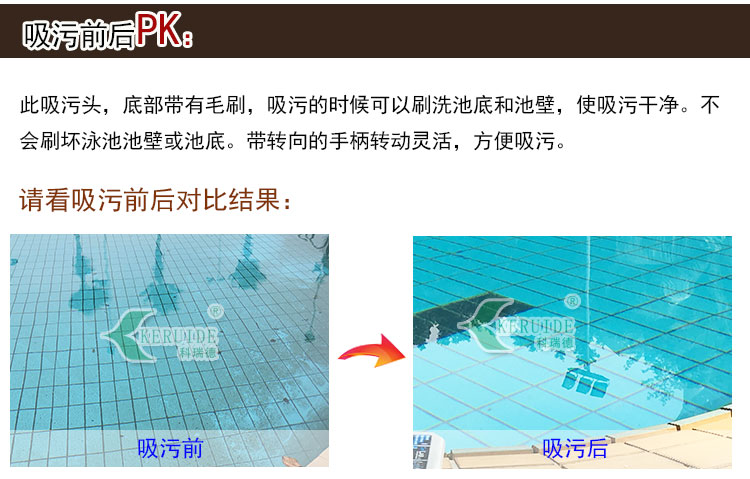 此吸污頭底部帶有毛刷,吸污的時候可以刷洗池底和池壁,使吸污干凈。毛刷為塑料毛刷,不會刷壞泳池池壁或池底。帶轉向的手柄轉動靈活,方便吸污。