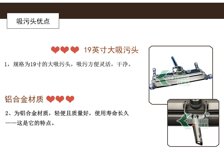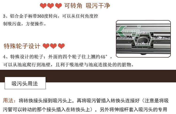 3,鋁合金手柄帶360度轉向,可以從任何角度控制吸污盤,方便操作。