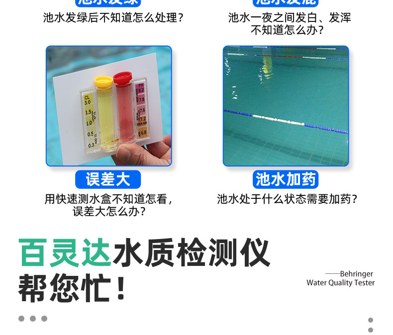 游泳池日常維持余氯和PH控制很重要,這就需要檢測泳池水質(zhì)。百靈達Pooltest3三參數(shù)水質(zhì)檢測儀提供了一個水質(zhì)管理方案——一款快速、可靠的光度計,能夠檢測3個不同的參數(shù)。