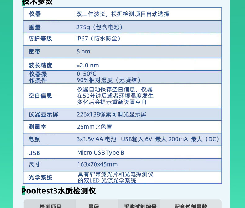 檢測3個參數(shù):余氯(游離態(tài)和總余氯),PH和氰尿酸,因此也叫多參數(shù)水質(zhì)檢測儀。
