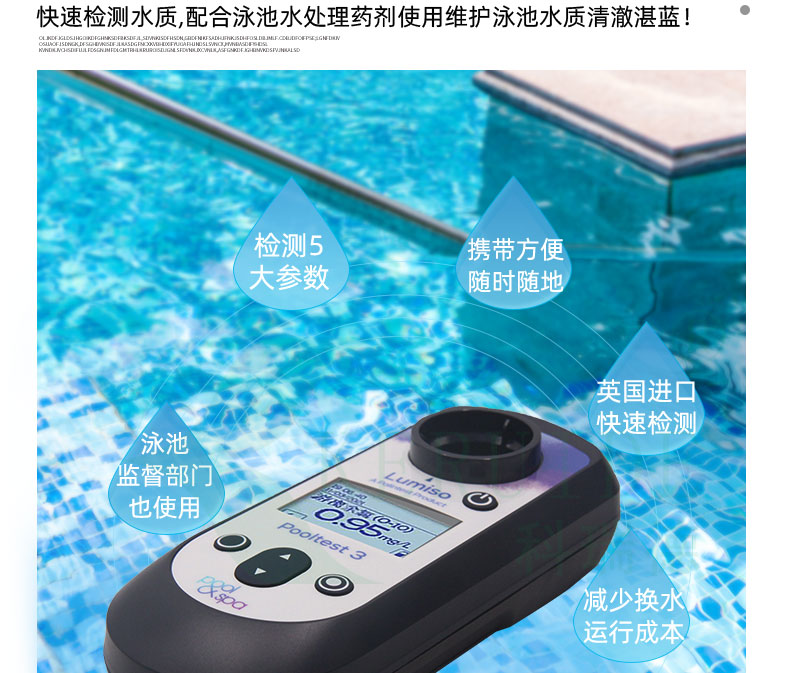 Pooltest3三參數(shù)水質(zhì)檢測儀操作方便,便于攜帶,檢測快速,因此廣泛用于泳池水質(zhì)檢測。