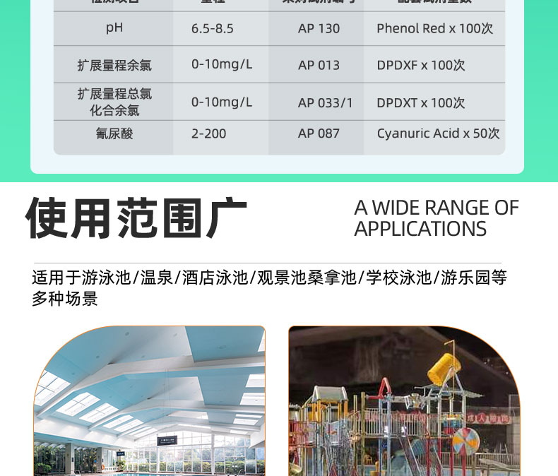 用于檢測余氯(游離態(tài)和總余氯),PH和氰尿酸;
