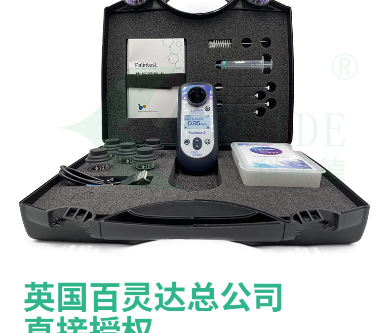 含Pooltest3光度計主機、5支比色管、試管刷、碾棒等所有配件和操作說明書,置于硬質(zhì)便攜箱中提供。