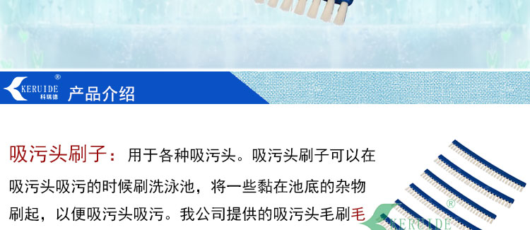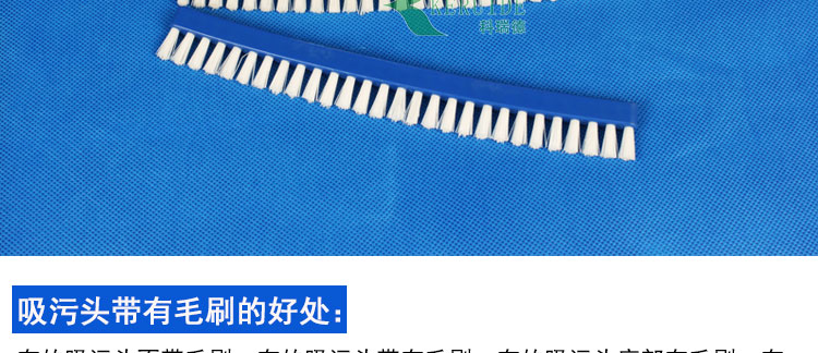 吸污頭刷子:用于各種吸污頭。吸污頭刷子可以在吸污頭吸污的時(shí)候刷洗泳池,將一些黏在池底的雜物刷起,以便吸污頭吸污。我公司提供的吸污頭毛刷毛質(zhì)好,整齊不易脫落。