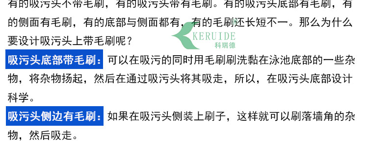 吸污頭帶有毛刷的好處,有的吸污頭不帶毛刷,有的帶有毛刷,那么為什么要設(shè)計(jì)吸污頭上帶毛刷呢,有的吸污頭的毛刷還是底部與側(cè)面都有,有的毛刷還長(zhǎng)短不一。吸污頭帶有毛刷,可以在吸污的同時(shí)用毛刷刷洗黏在泳池底部的一些雜物,將雜物揚(yáng)起,然后在通過(guò)吸污頭將其吸走,如果在吸污頭側(cè)裝上刷子,這樣就可以刷落墻角的雜物,然后吸走。