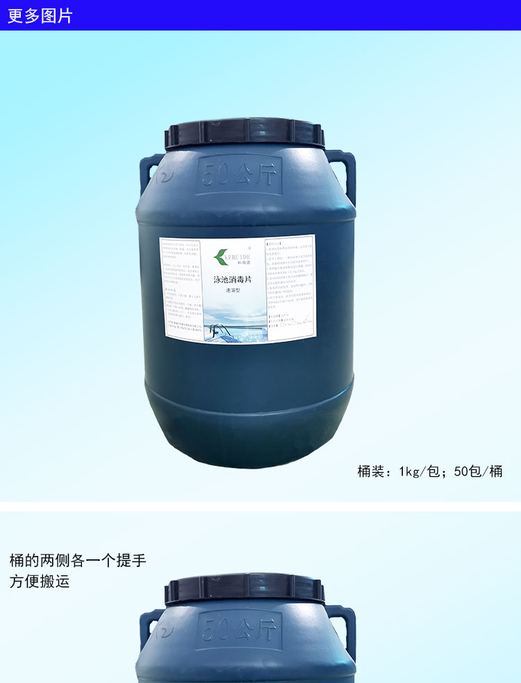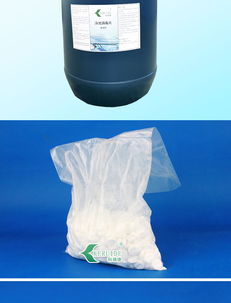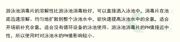 游泳池消毒片的溶解性比游泳池消毒粉好,可以直接灑入泳池中,消毒片在池底迅速溶解,均勻地?cái)U(kuò)散到整個(gè)泳池水中,能快速提高泳池水中的余氯,適合開(kāi)場(chǎng)前補(bǔ)充余氯,并且特別適合沒(méi)有循環(huán)設(shè)備的泳池使用。游泳池消毒片的PH值接近中性,因此使用時(shí)對(duì)泳池水的PH值影響較小。