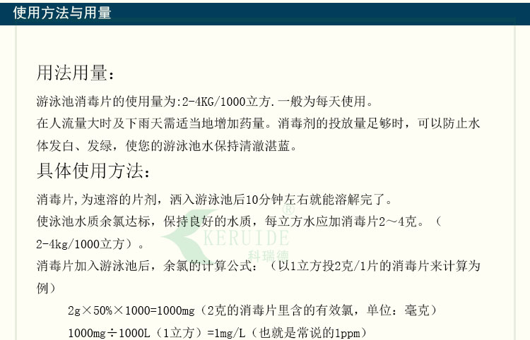 【用法用量】:用于游泳池水消毒時(shí),每天用量約為每1000立方投放2-4公斤,泳客較多或下雨天氣時(shí)要適當(dāng)?shù)卦黾铀幜俊S斡境叵酒耐斗帕孔銐驎r(shí),可以防止水體發(fā)白、發(fā)綠,使你的游泳池水保持清澈湛藍(lán)。