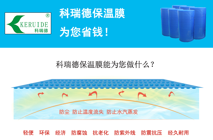 科瑞德游泳池/溫泉/水療池/嬰幼兒游泳池保溫膜是專用于給池子里的水保溫的,是實用,也是高效的節(jié)能保溫方法,環(huán)保、方便、性價比高;保溫膜鋪在水面,會與水面形成無縫拼接,隔絕水汽與溫度的蒸發(fā),從而達(dá)到保溫的效果,根據(jù)多年實踐經(jīng)驗以及用戶使用反饋證明,使用保溫膜可以讓商家節(jié)省加熱成本,除此之外,它還有防塵、防水蒸氣蒸發(fā)的效果,也間接為用戶節(jié)省了用水成本和清潔泳池的成本,是冬日各種游樂場館池子的節(jié)能神器。
