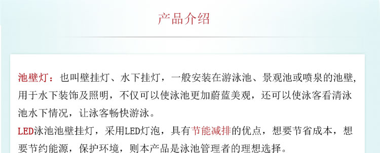 LED泳池池壁掛燈,采用LED燈泡,具有節(jié)能減排的優(yōu)點,想要節(jié)省成本,想要節(jié)約能源,保護環(huán)境,則本產(chǎn)品是泳池管理者的理想選擇。