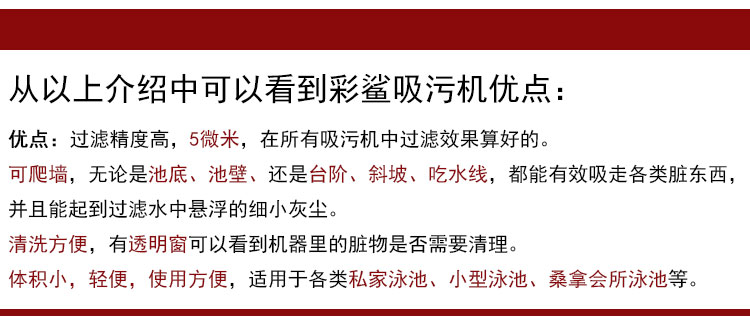 【適用范圍】彩鯊吸污機體積小,輕便,使用方便,適用于各類私家泳池、別墅泳池,小型泳池、桑拿會所泳池等。另外,彩鯊吸污機保修期為1年,客戶可放心購買和使用。