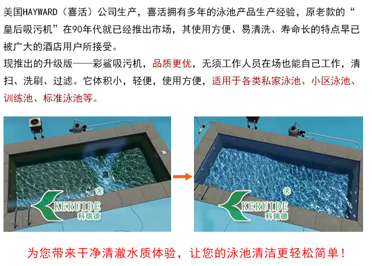 【品牌介紹】:彩鯊游泳池吸污機由美國HAYWARD亨沃(喜活)公司生產(chǎn),是皇后吸污機的升級版。喜活擁有多年的泳池產(chǎn)品生產(chǎn)經(jīng)驗,擁有先進的全自動吸污機技術(shù),使用方便、易清洗、壽命長。