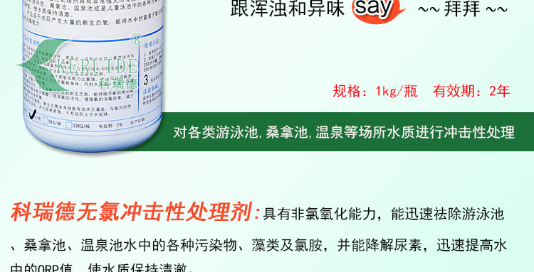 科瑞德無氯沖擊性處理劑具有非氯氧化能力,能迅速祛除游泳池、桑拿池、水療池中的各種污染物、藻類及氯胺,并能降解尿素,迅速提高水中的ORP值,使水質(zhì)保持清澈。