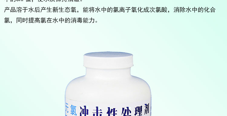 產(chǎn)品溶于水后產(chǎn)生大量的新生態(tài)氧,能將水中的氯離子氧化成次氯酸,消除水中的化合氯,同時提高氯在水中的消毒能力。