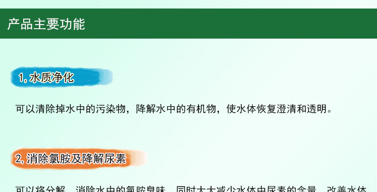 1,水質(zhì)凈化:可以氧化掉水中的污染物,降解水中的有機(jī)物,使臟而渾濁的水體恢復(fù)澄清和透明。