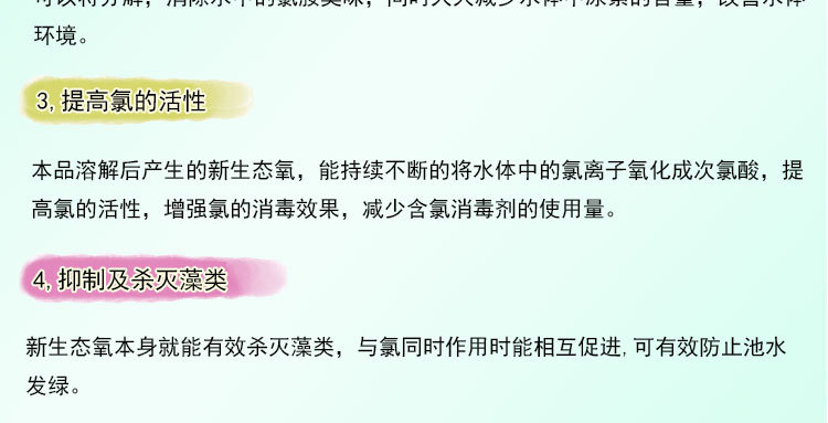 4,抑制及殺滅藻類:新生態(tài)氧本身就能有效殺滅藻類,與氯同時作用時能相互促進(jìn),可有效防止池水發(fā)綠。