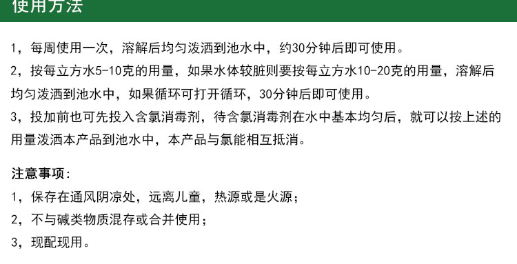 2,按每立方水5-10克的用量,如果水體較臟則要按每立方水10-20克的用量,溶解后均勻潑灑到池水中,如果循環(huán)可打開循環(huán),30分鐘后即可使用。