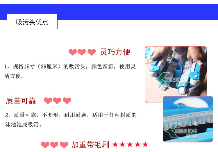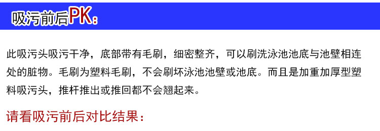 此吸污頭吸污效果很好,底部帶有高級毛刷,細密整齊,可以刷洗泳池池底與池壁相連處的臟物,使泳池清潔無死角。毛刷為塑料毛刷,不會刷壞泳池池壁或池底。而且是加重加厚型塑料吸污頭,推桿推出或推回都不會翹起來。