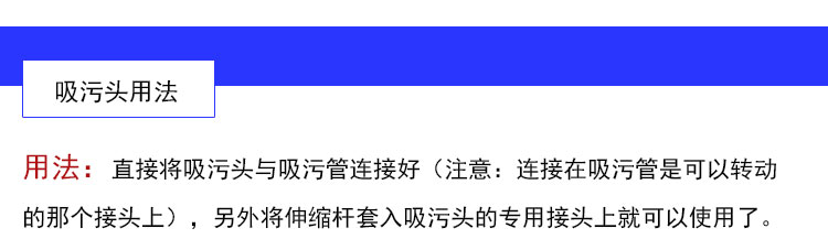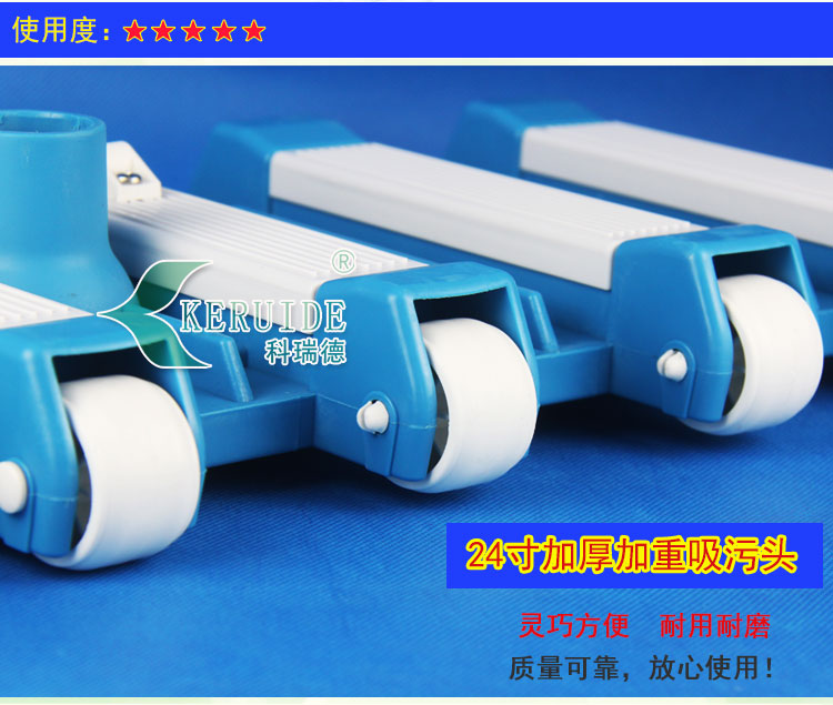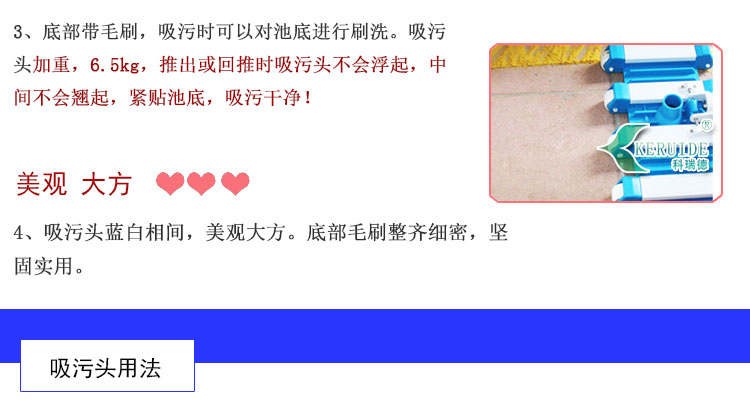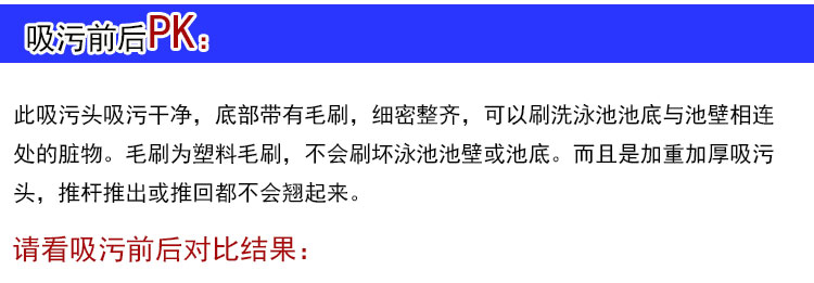 【用法】:直接將吸污頭與吸污管連接好(注意是連接在吸污管可以轉動的那個接頭上),另外將伸縮桿套入吸污頭的專用接頭上就可以使用了。底部側面均帶毛刷,底部毛刷可拆卸,游泳池吸污頭不傷池底,適用于任何材質的游泳池。