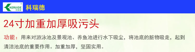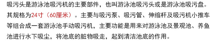 游泳池吸污頭:24寸加重加厚吸污頭,是新型高效的游泳池吸污頭。帶刷毛,塑料材質,加重加厚!配塑料手柄、底部帶毛刷,吸污時可以對池底進行刷洗,可以邊吸污邊刷洗池底,操作靈活、方便。是為各類泳池設計的游泳池吸污頭。