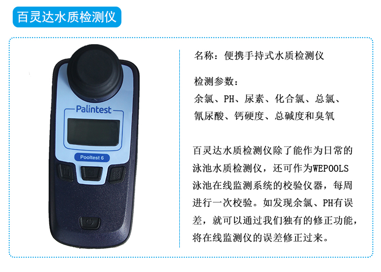 如下圖就是英國百靈達水質監測儀,廣泛用于現場檢測泳池水的余氯、PH值。因此,我們建議游泳池也使用百靈達水質檢測儀作為校驗儀器,每周進行一次校驗。