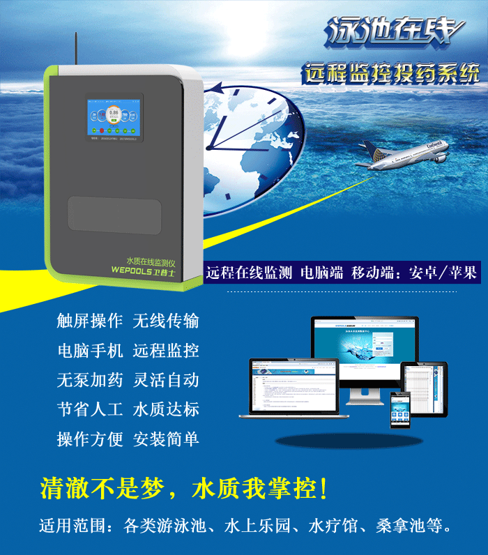 智能化全自動水質監控系統:游泳池余氯PH在線監測儀,也叫泳池余氯PH在線檢測儀,實時在線監控泳池水的余氯和PH、溫度,自動控制加藥,讓余氯PH時刻保持在設定值,簡單方便,節省消毒藥和減少人工,保證泳池水質穩定達標。