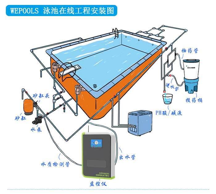 WEPOOLS泳池在線監測系統安裝簡單,投藥桶與監測儀的進出水管道都是安裝在循環管道中,如下圖所示: