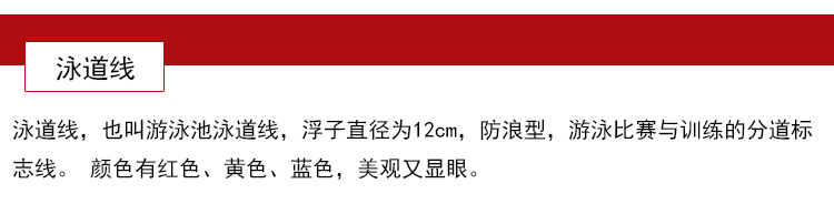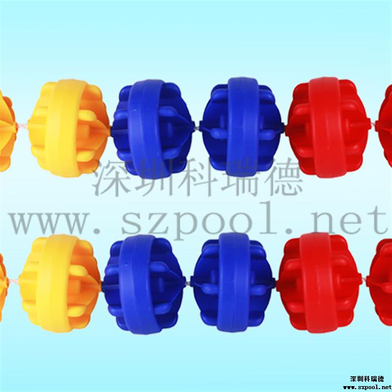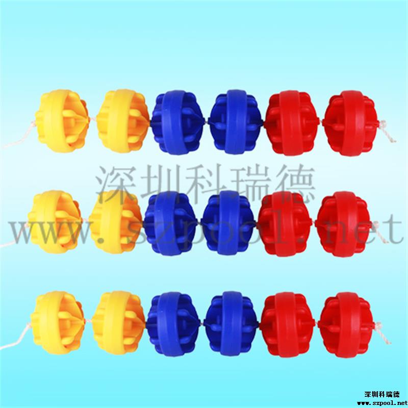 游泳池泳道線也叫游泳池分道線或分水線.泳道線浮子直徑為12cm,防浪型,是游泳比賽或訓練的分道標志線。