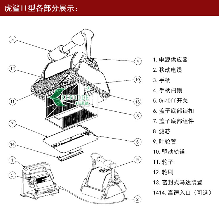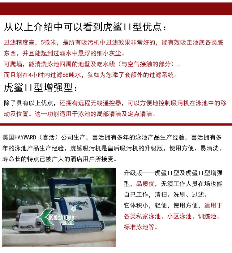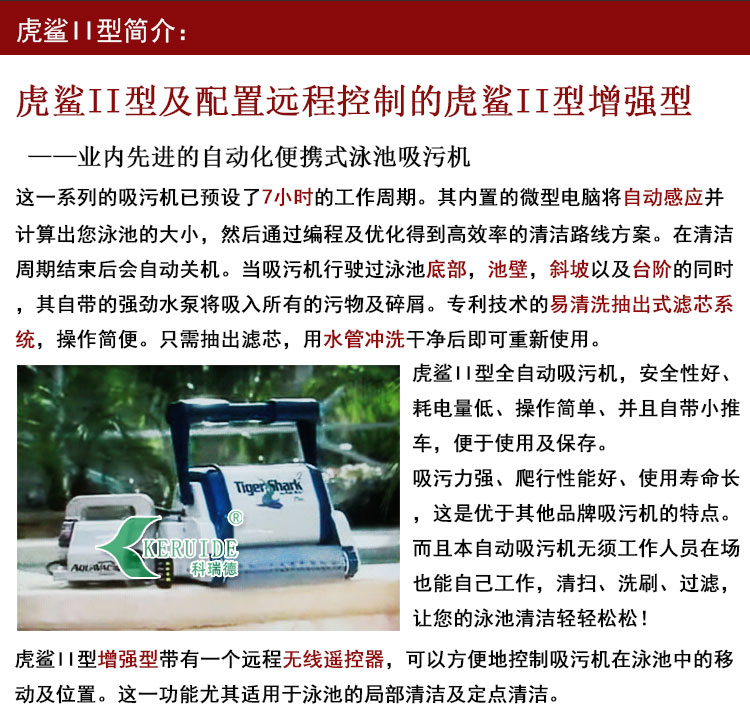 虎鯊吸污機是游泳池吸污機的一種,是全自動吸污機的一種,RC-2:虎鯊II型:無遙控,可爬墻,30米電纜線