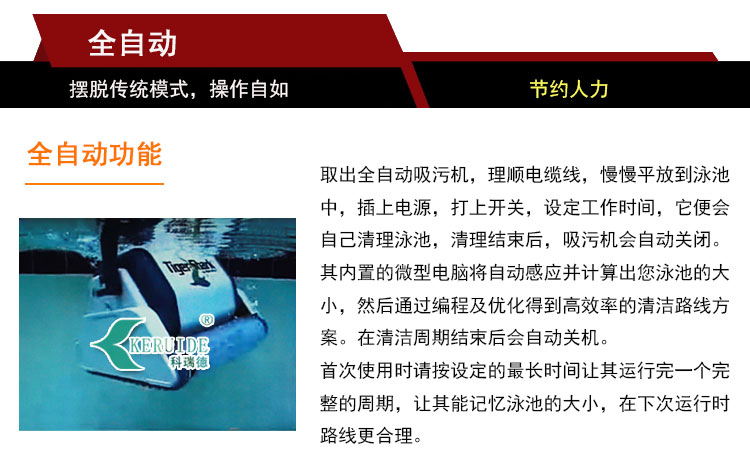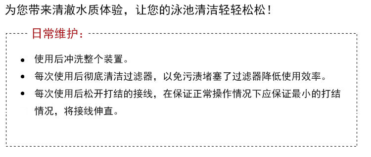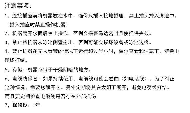 【用法】:取出虎鯊游泳池吸污機理順電纜線,站長岸邊慢慢平放到泳池中,然后插上電源,打上開關,設定工作時間后,它便會自己清理泳池。清理結束后虎鯊會自動停止工作。首次使用時請按設定的最長時間讓其運行完一個完整的周期,讓其能記憶泳池的大小,在下次運行時路線更合理。