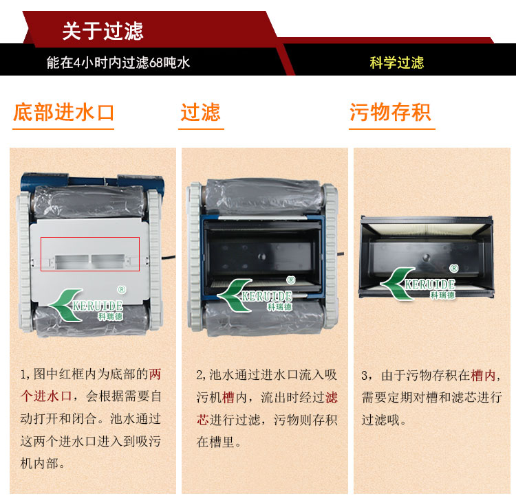 【優點】:虎鯊吸污機的過濾精度僅為5微米,是過濾精度較高的,不但能有效吸走池底各類臟東西,如樹葉,沙子,毛發等,還能過濾水中懸浮的細小灰塵,使池水干凈清澈透亮。