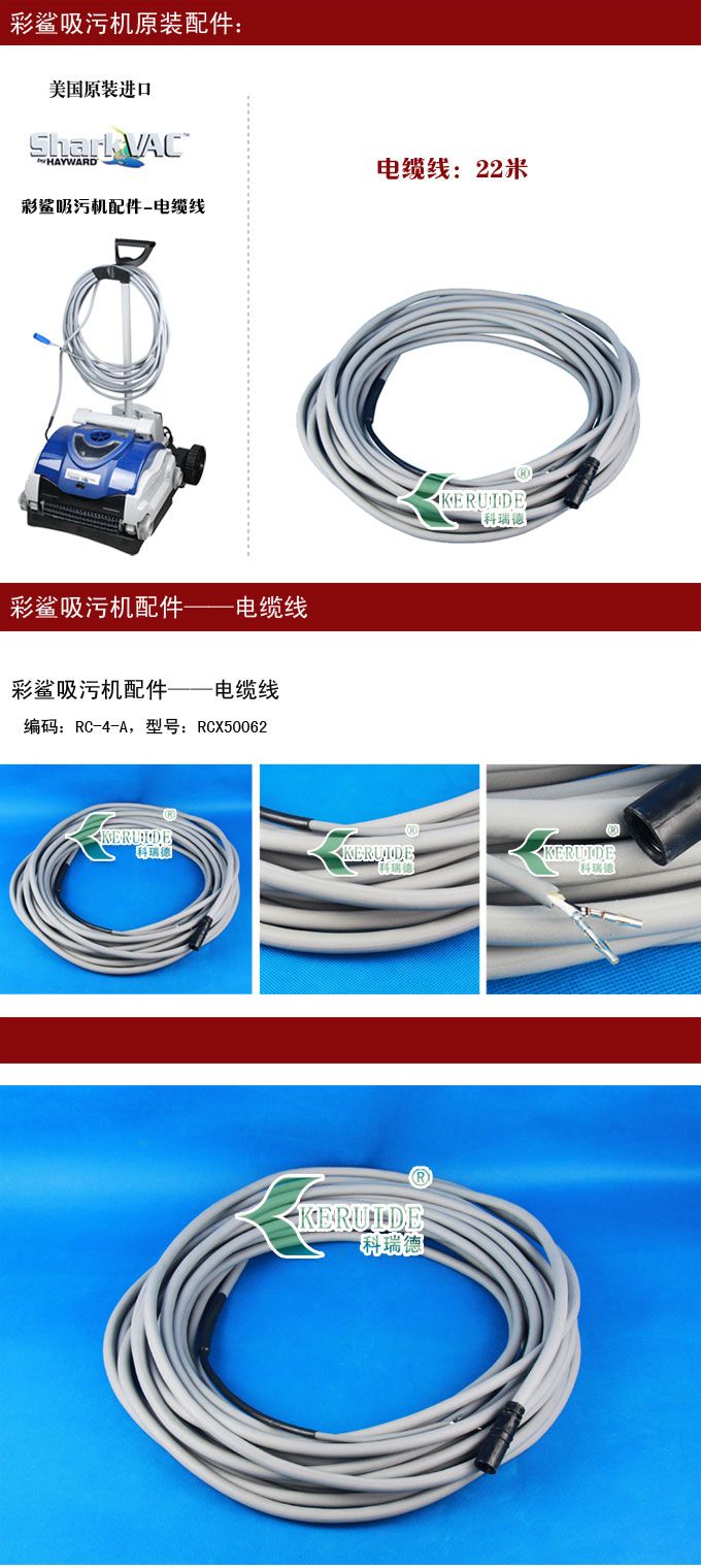 彩鯊全自動吸污機(jī)配件——電纜線,編碼:RC-4-A,型號:RCX50062,長度為22米。