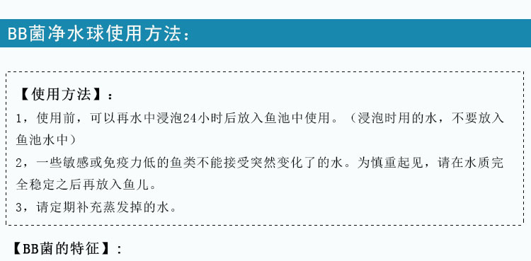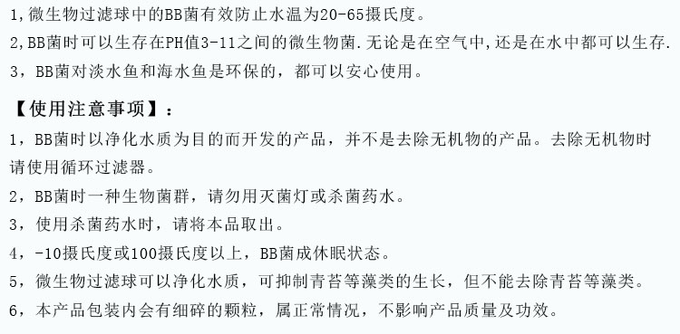 3)本產品為微生物過濾球,從投入到形成良好穩定的水質,根據魚的數量和養魚的環境,需要2-3周的適應期。